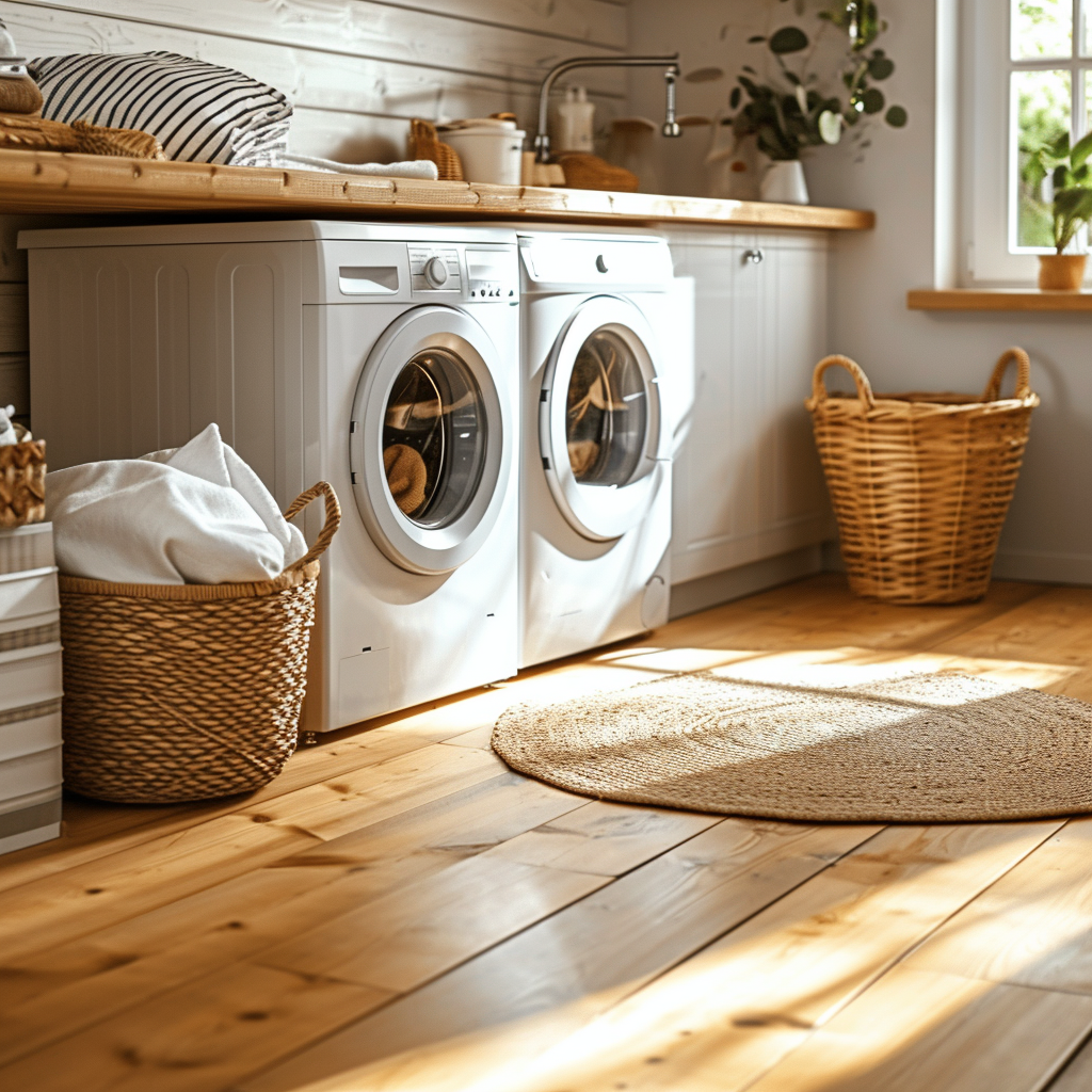 Begin by cleaning ceiling vents, lights, and switches. Dust behind and under your washing machine and dryer. Clean your dryer vent and the inside of your washing machine. To refresh your washing machine, clean out the filters, then run a hot cycle with half a cup of baking soda and two cups of vinegar in the detergent tray.