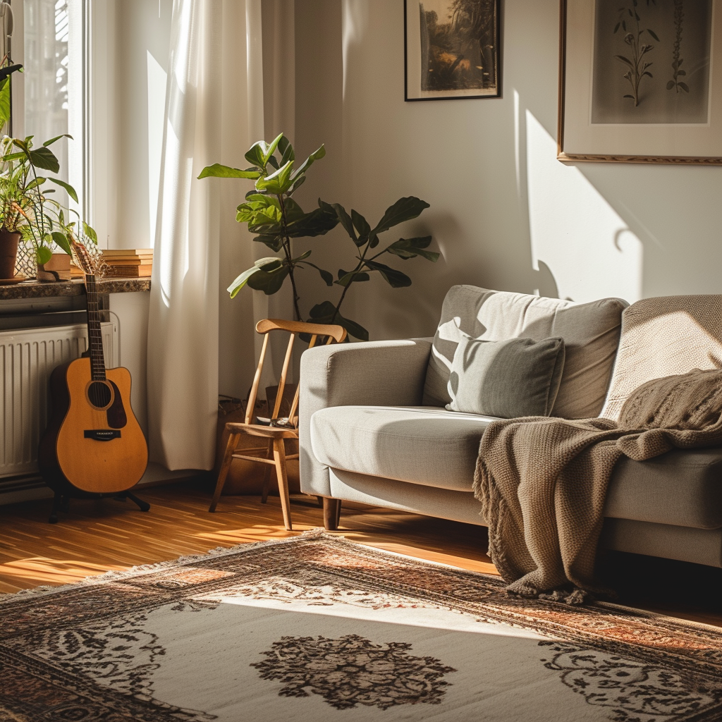 Remove books and knick-knacks from shelves, wipe surfaces with a damp cloth, and consider donating items you no longer use. Vacuum thoroughly to keep rugs clean and free of allergens and dust. For stained carpets or rugs, consider professional cleaning annually to maintain freshness.