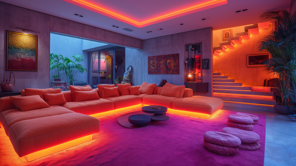 Light up your accent wall with a neon sign. Whether it’s a favorite quote, a fun phrase, or a custom design, neon lights add a quirky and modern touch to any room. They’re perfect for adding a bit of brightness and personality.