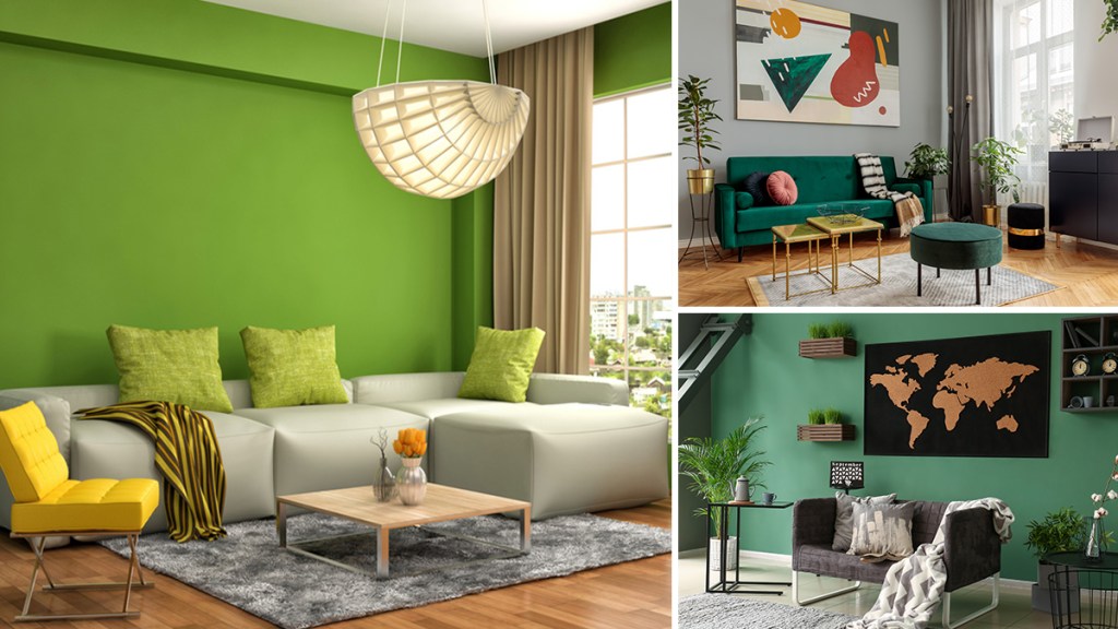 The green feature wall here gets beautifully complemented with the grey furniture all around it, leaving nothing more to be desired.