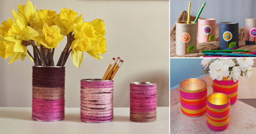 Once you are done covering the entire container with the tape, remove the top layer of the double-sided tape so that the surface of the container is all sticky. Now, start covering the container with yarn starting from the top, making sure it sticks to the container surface firmly. You can use as many colors as you want, to make a pattern that you desire. And your DIY yarn- wrapped vase is ready! You can embellish it with bows, colorful buttons or jewels (if you’d like) which you can stick on the yarn with synthetic adhesive.