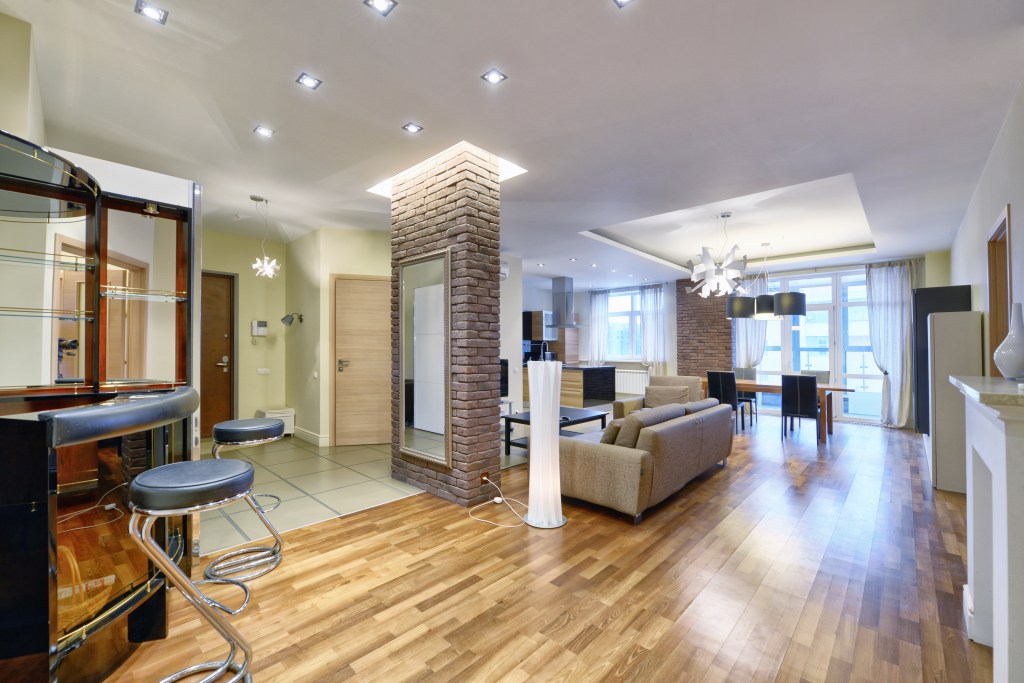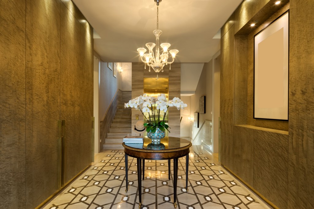 Could overhead lighting be any more beautiful? Notice how the lights above the pillar accentuate the stone cladding that the pillar is covered in.
