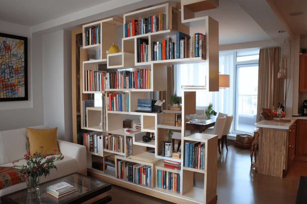 A tall, open bookshelf or display unit is one of the easiest ways to define space without blocking light or airflow. Since the shelves have open backs, the room stays bright and airy, but you still get a subtle separation. Style the shelves with plants, baskets, framed photos, and everyday essentials to make the “divider” feel intentional, not bulky.