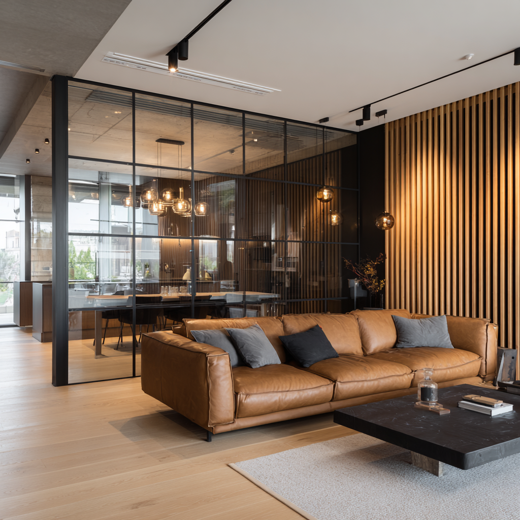 If you want something more polished but still lightweight, try a glass partition. Clear or ribbed glass breaks up the space visually while keeping everything bright. It’s perfect for creating a quiet work nook or semi-private dining corner within a larger living room.