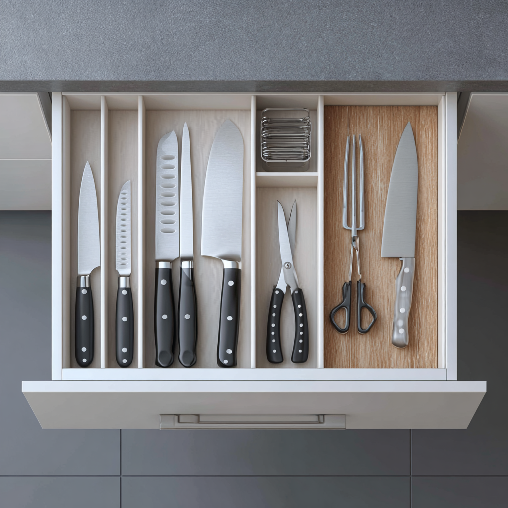 Sharp objects like knives represent cutting energy — literally and symbolically. Leaving them out in plain sight can create tension in a space that should feel nurturing.