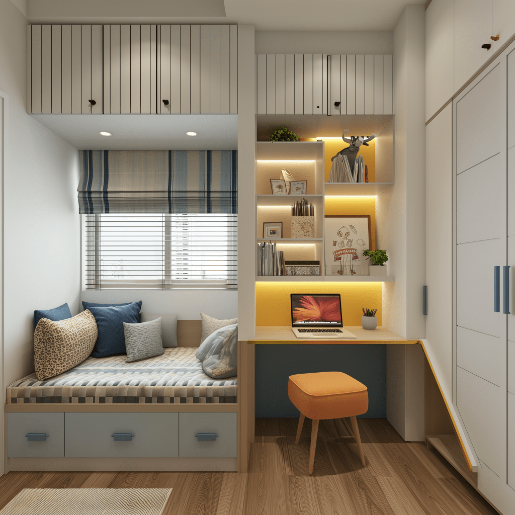 Shelving is where your investment pays off in the long run. A well-designed shelf system houses everything from childhood trophies to teenage novels, offering a canvas for your child’s evolving interests. It’s a space where personal stories unfold, making it a meaningful corner in their room.
