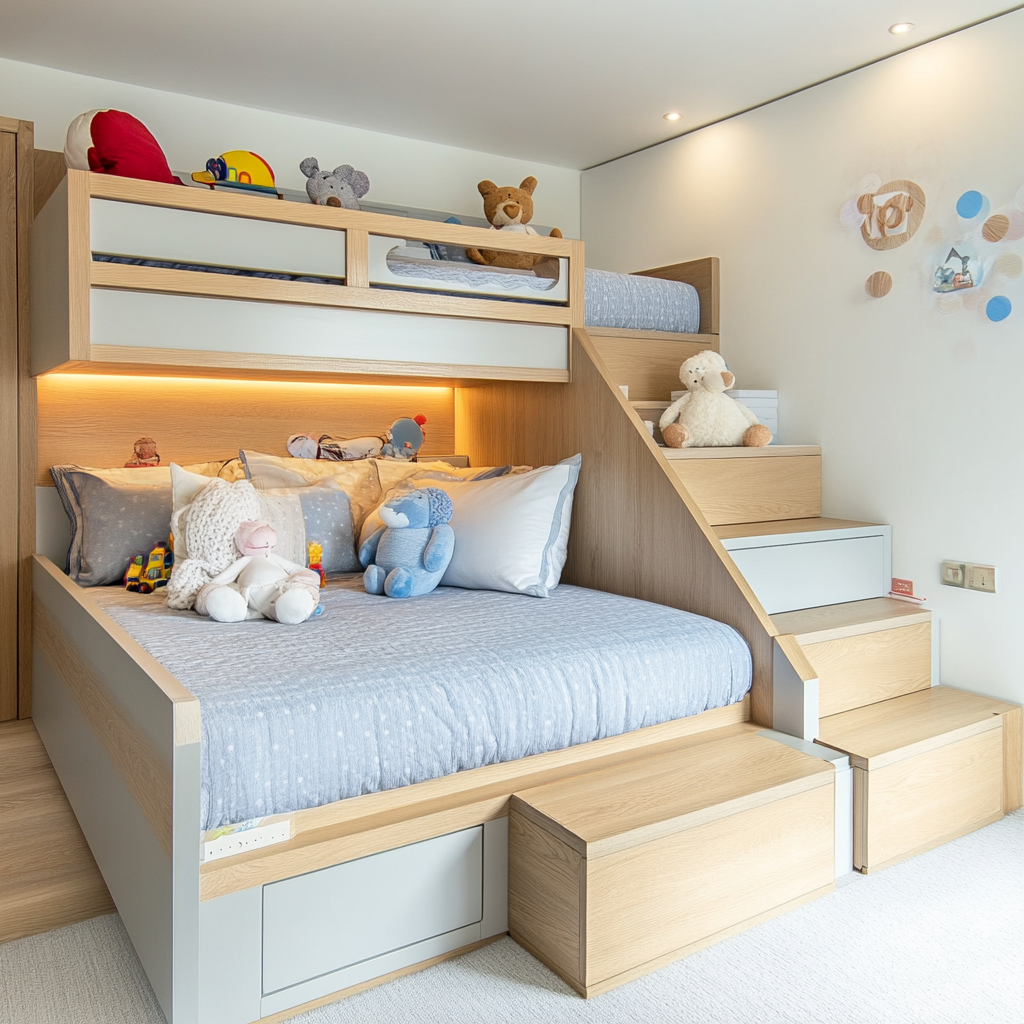Many bunk beds come with built-in storage options, such as drawers under the lower bunk, shelves for toys, mini wardrobes, and steps that double as storage drawers. These features make it easier to keep the room tidy and organized, ensuring that every inch of space is used efficiently.