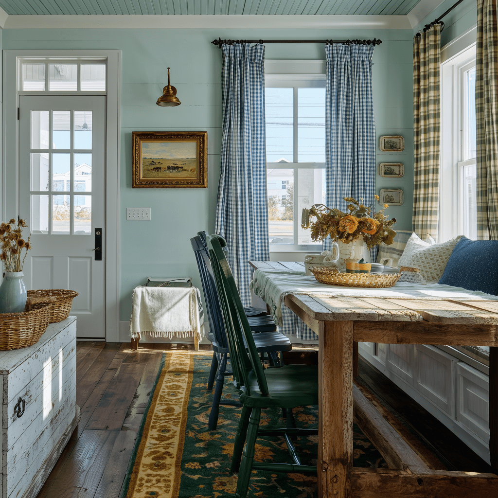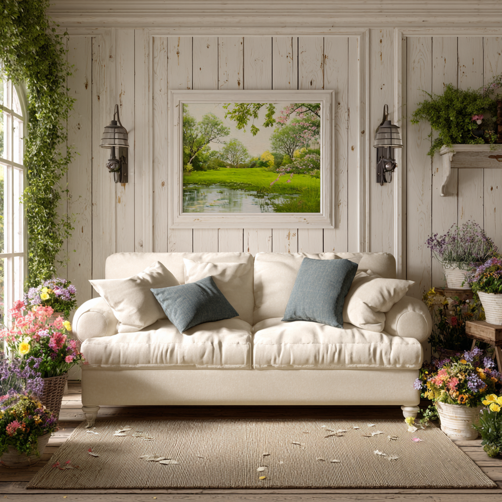 Cottage palettes stay gentle. Creams, whites, beiges, and sandy neutrals act as calming backdrops. Pastels like powder blue, butter yellow, sage green, and soft rose add quiet personality.