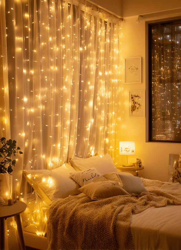 A headboard is a natural focal point of a bedroom, and draping fairy lights around it instantly enhances its beauty. Whether it is a wooden headboard, a fabric one, or a simple bed frame, wrapping a string of fairy lights around the perimeter or weaving them through the frame adds a delicate, twinkling glow. This creates a cozy and romantic backdrop for the bed, making it feel like a comforting retreat.