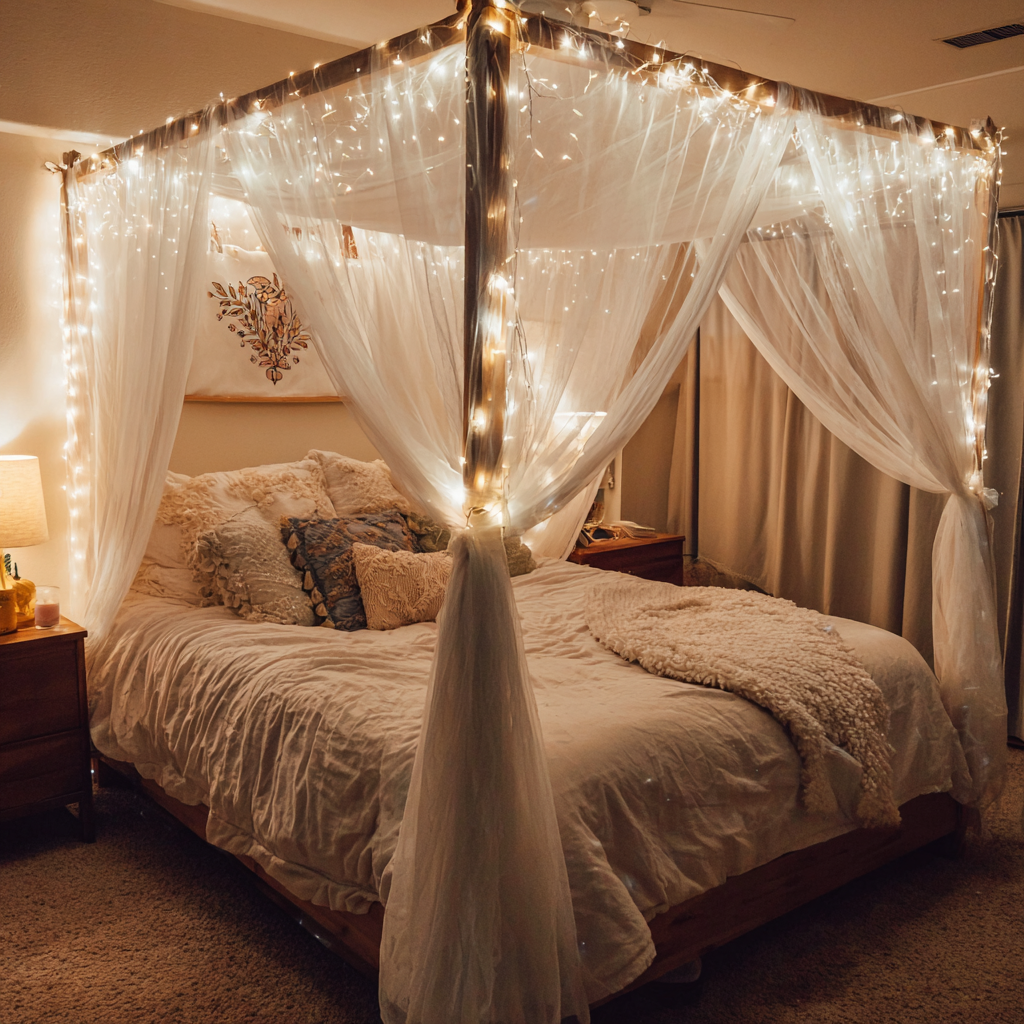 If your bedroom has a four-poster bed or a canopy, fairy lights can take it to the next level. Weaving them through the fabric or around the frame of the canopy creates a magical, intimate cocoon. This provides a gentle source of light that is perfect for late-night reading or simply for adding a warm, comforting glow to your personal space. It is a simple idea that feels incredibly luxurious and cozy.