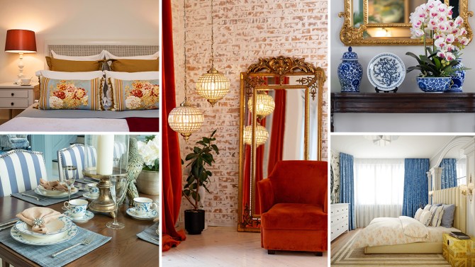 Notice the color schemes used in French décor, ranging from golden yellow and red to cornflower blue and white.