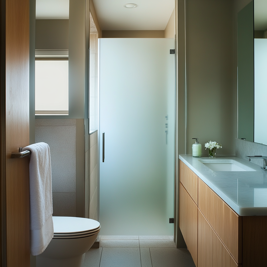 A frosted glass shower enclosure keeps bathrooms feeling spacious while adding a layer of privacy. Kitchen cabinets with textured glass doors create a stylish, semi-transparent effect, allowing you to showcase beautiful dishware without full exposure. Even for front doors, frosted glass panels provide natural light without compromising security.