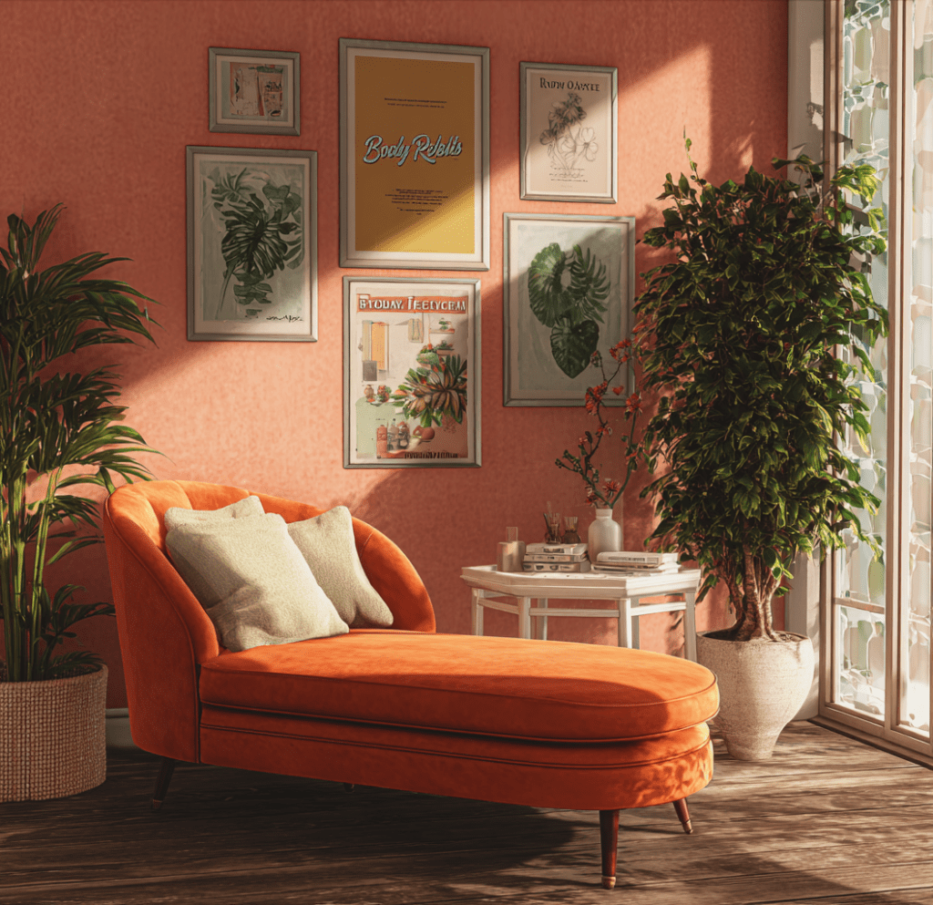 Too much bright orange can feel like emotional “volume up.” A softer terracotta or warm peach shade brings cheer without hyperdrive.