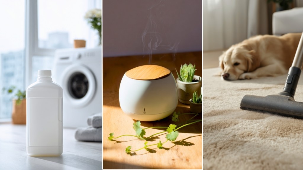 If you have cats, scoop the litter box daily and change litter at least twice a week. Choose a covered box or place it in a well-ventilated corner. For dogs, wipe food and water bowls after every meal — leftover crumbs or drool can cause a mild but persistent smell. A small indoor plant nearby (like a peace lily or spider plant) helps freshen the air naturally.