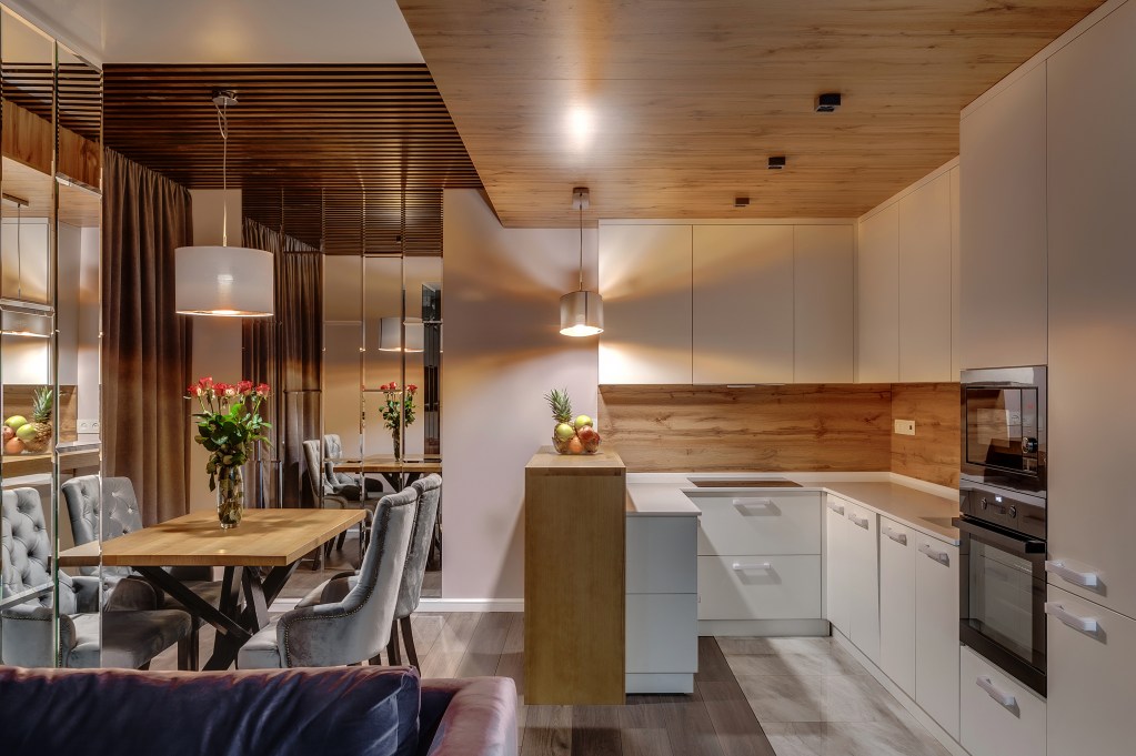 Mirrors are mystical wonders. They reflect your kitchen giving it the illusion of space, something your heart desires desperately. Pick likely spots in your kitchen to house your mirrors. Try them on dividing walls and cabinetry. If all else fails, a mirror on your columns or partition will suffice.