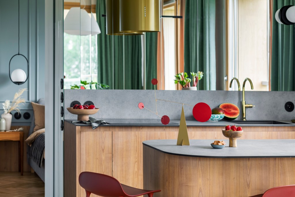 For open-plan kitchens, carry forward the mirror theme into the living space with mirror wall art.