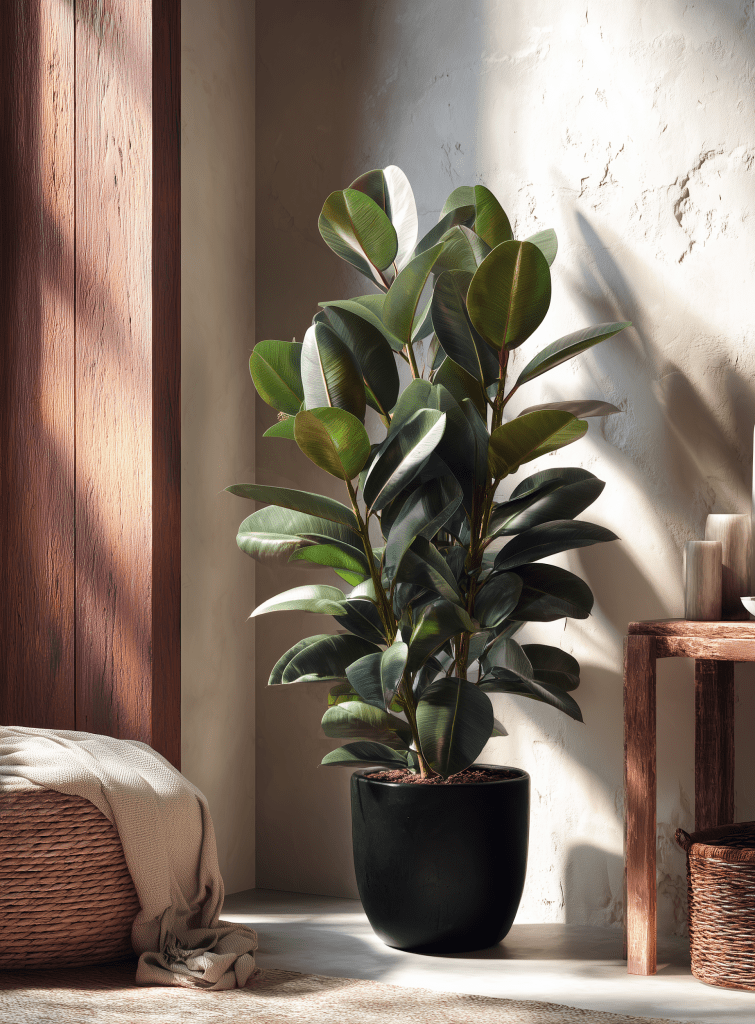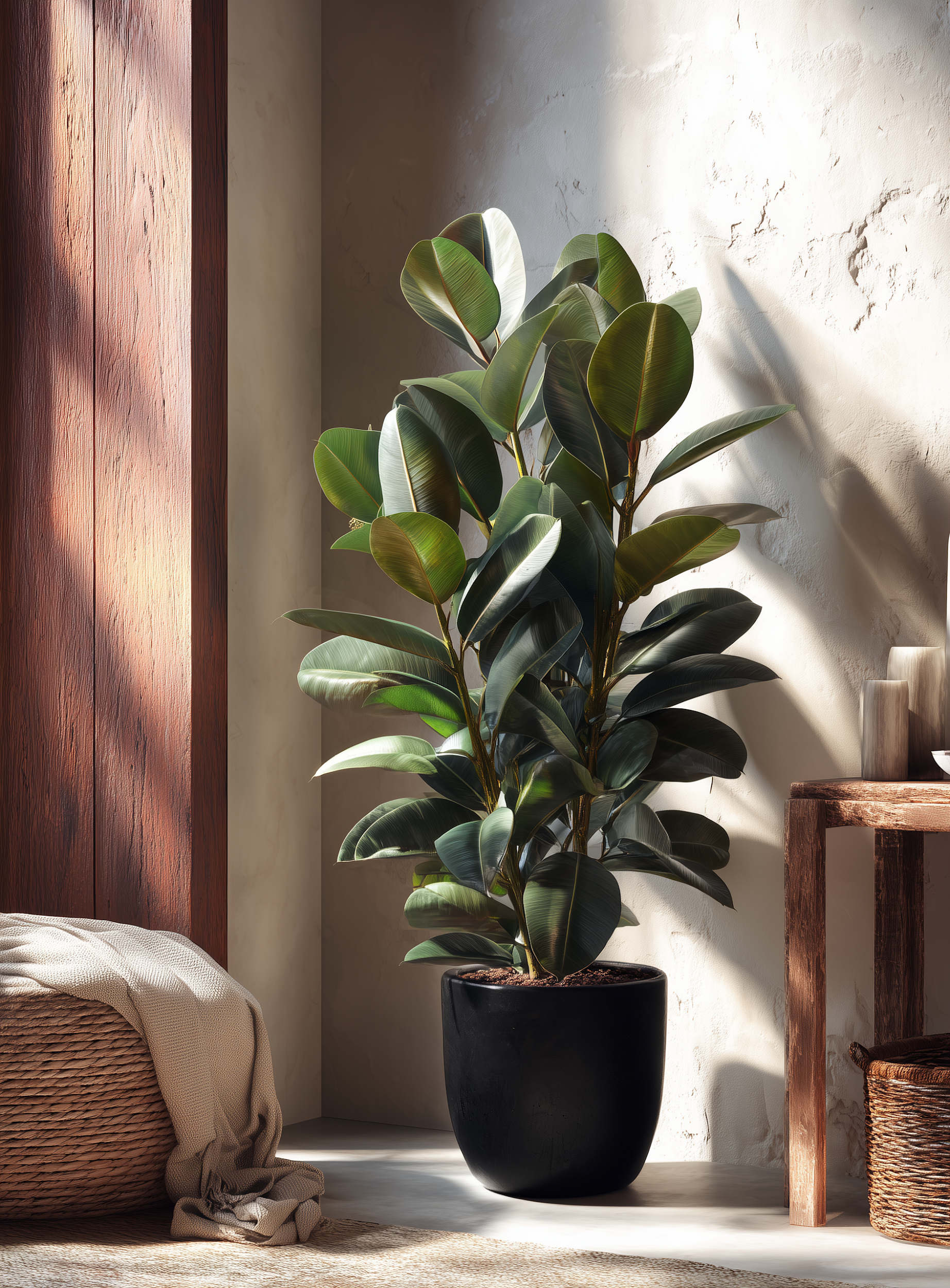 The rubber plant is perfect for anyone who loves drama but prefers a refined palette. Its deep green (or burgundy) glossy leaves instantly add weight and contrast to pale, neutral rooms.