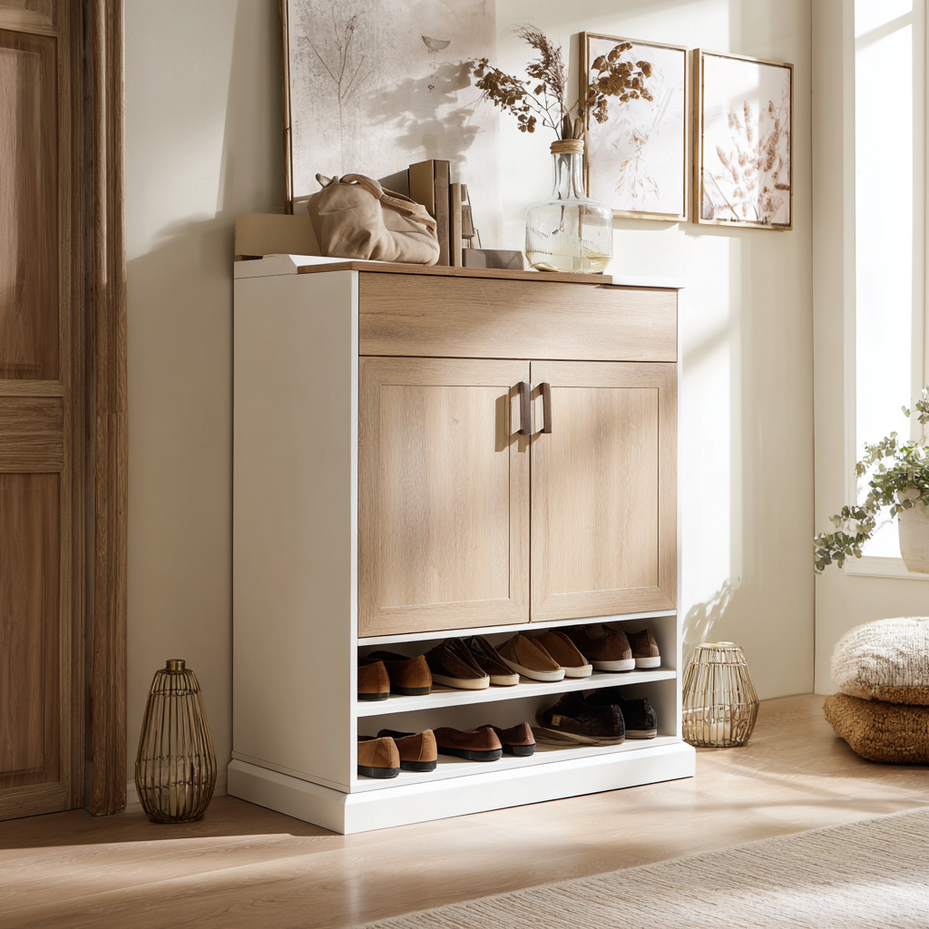 This option works particularly well in homes where you want a minimalist entrance but still need solid storage for everyday footwear and kids’ sneakers.