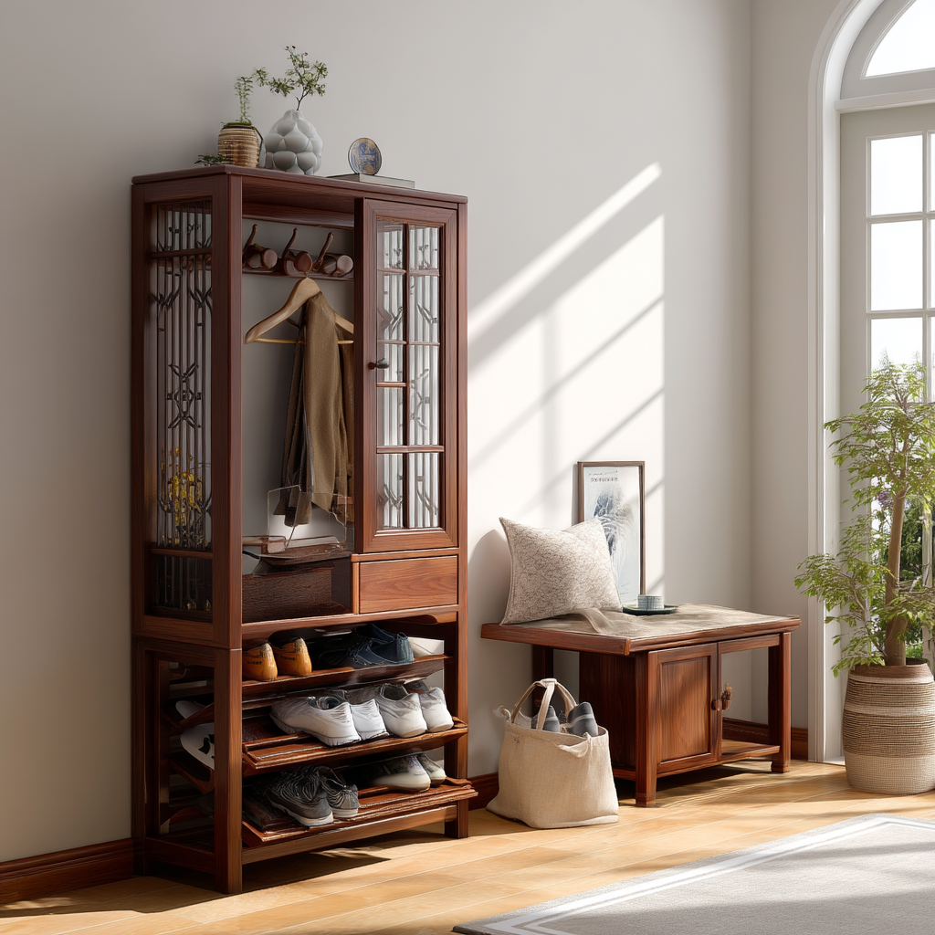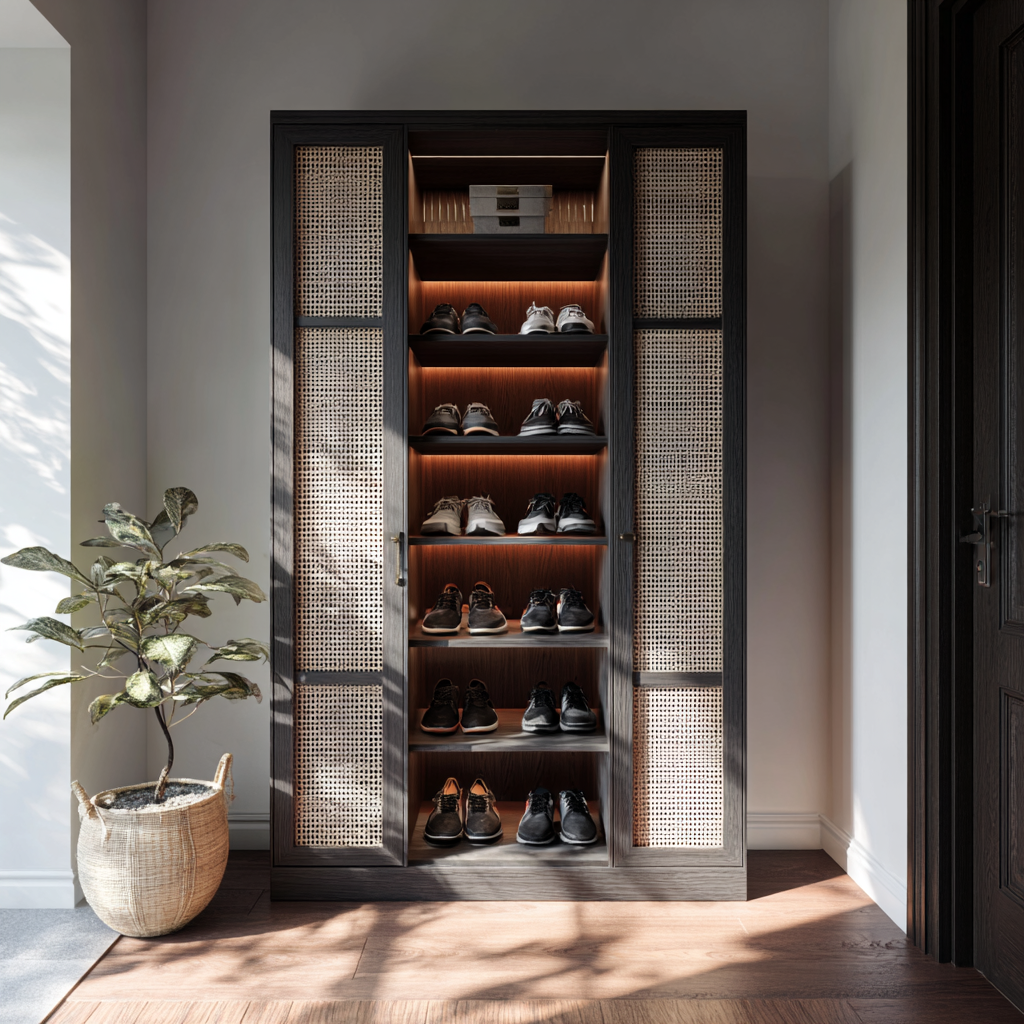 Add baskets, boxes, or stacked racks inside to organize pairs—this way, your entrance stays functional without looking like a storage closet.