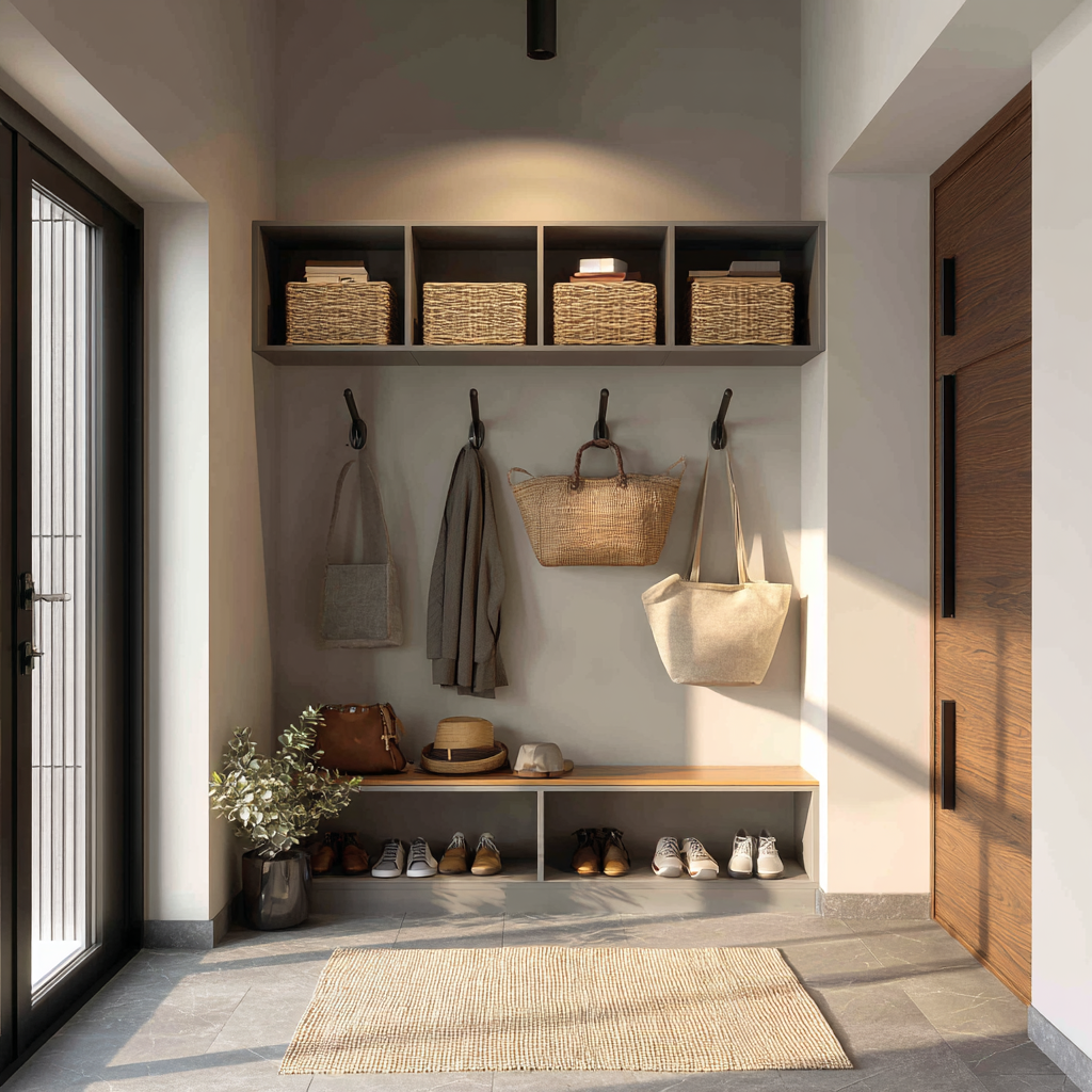 Even with structured storage, a decorative tray or basket near the door keeps the shoes you wear most often within easy reach.