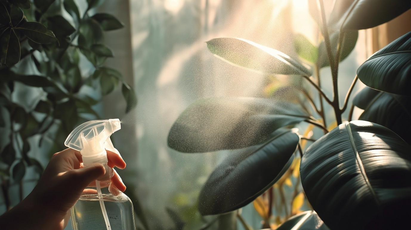 – If everything looks fine, spray the entire plant — stems, leaves, soil surface, and surrounding spaces.