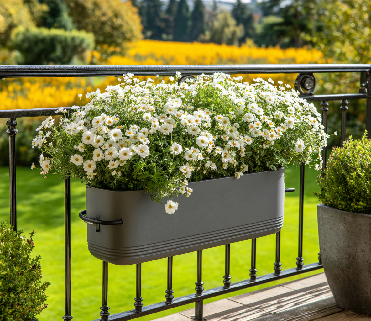 Planter railings bring greenery into the design itself. Built-in planters soften hard edges, add natural beauty, and increase privacy without taking up floor space.