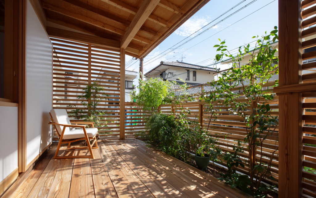 For outdoor durability, treated wood or high-quality wood-look materials work best. The warmth of wood balances greenery and outdoor furniture beautifully, even in tight spaces.