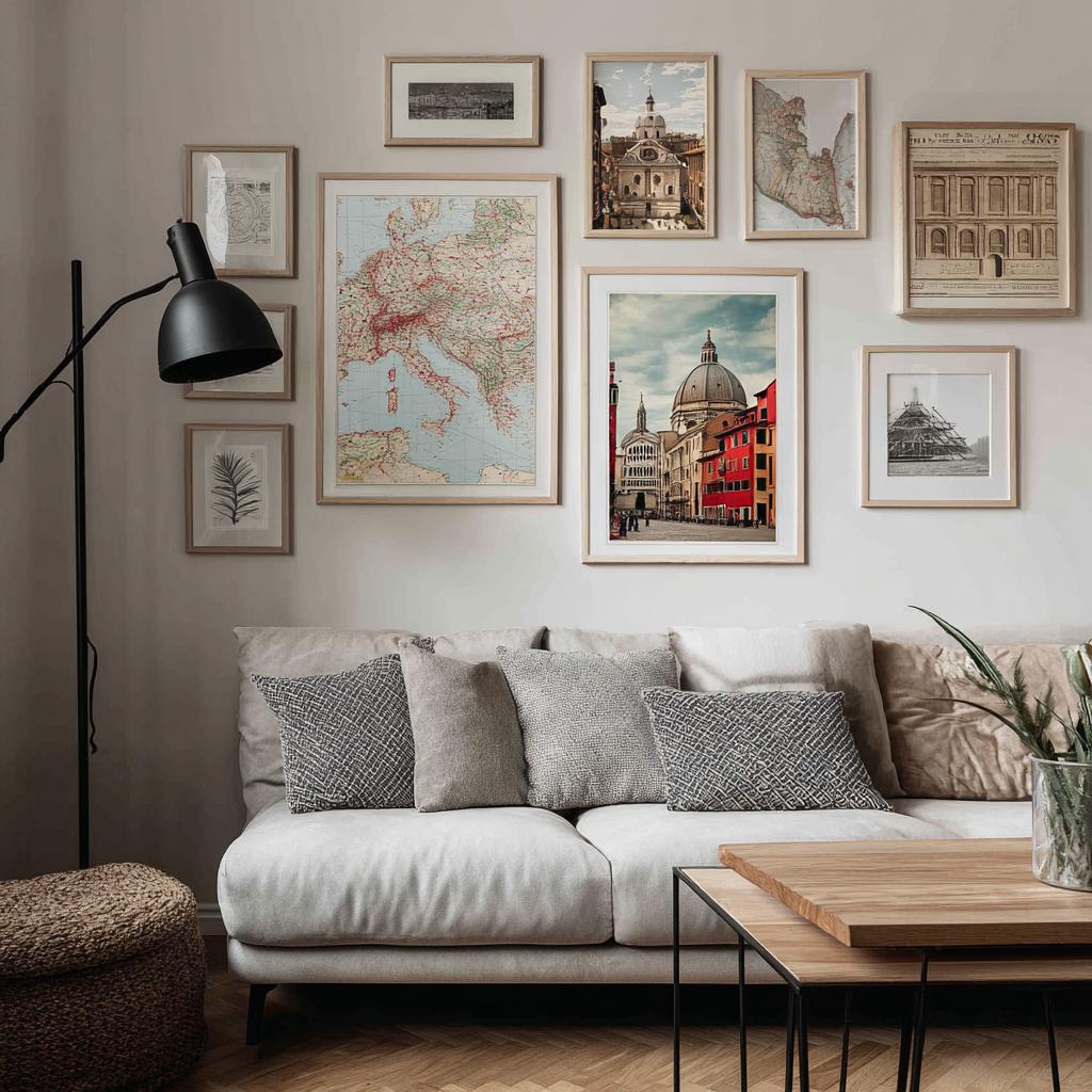 Maps are a travel lover’s classic — but they don’t have to look old-fashioned. Frame a world map, a city you love, or a route you traveled. You can even mark places you’ve visited subtly with pins or ink dots.