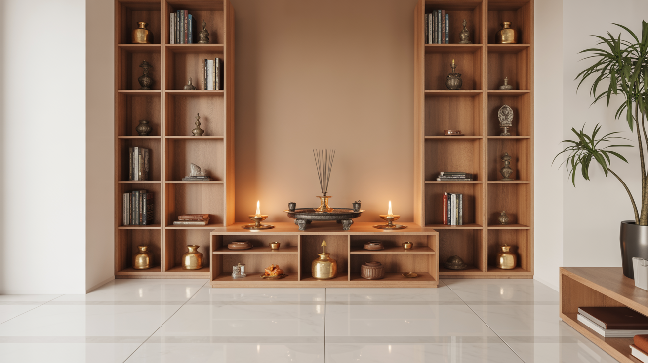 For apartments and multi-story homes, always place your main pooja room on the ground floor rather than in basements or upper floors. Ground-level placement creates better energy flow and makes the space more accessible for daily prayers.