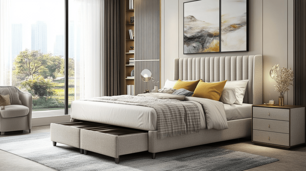 Use a bed with drawers that can come in really handy to stash away extra sheets, comforters and clothes that you don’t use frequently.
