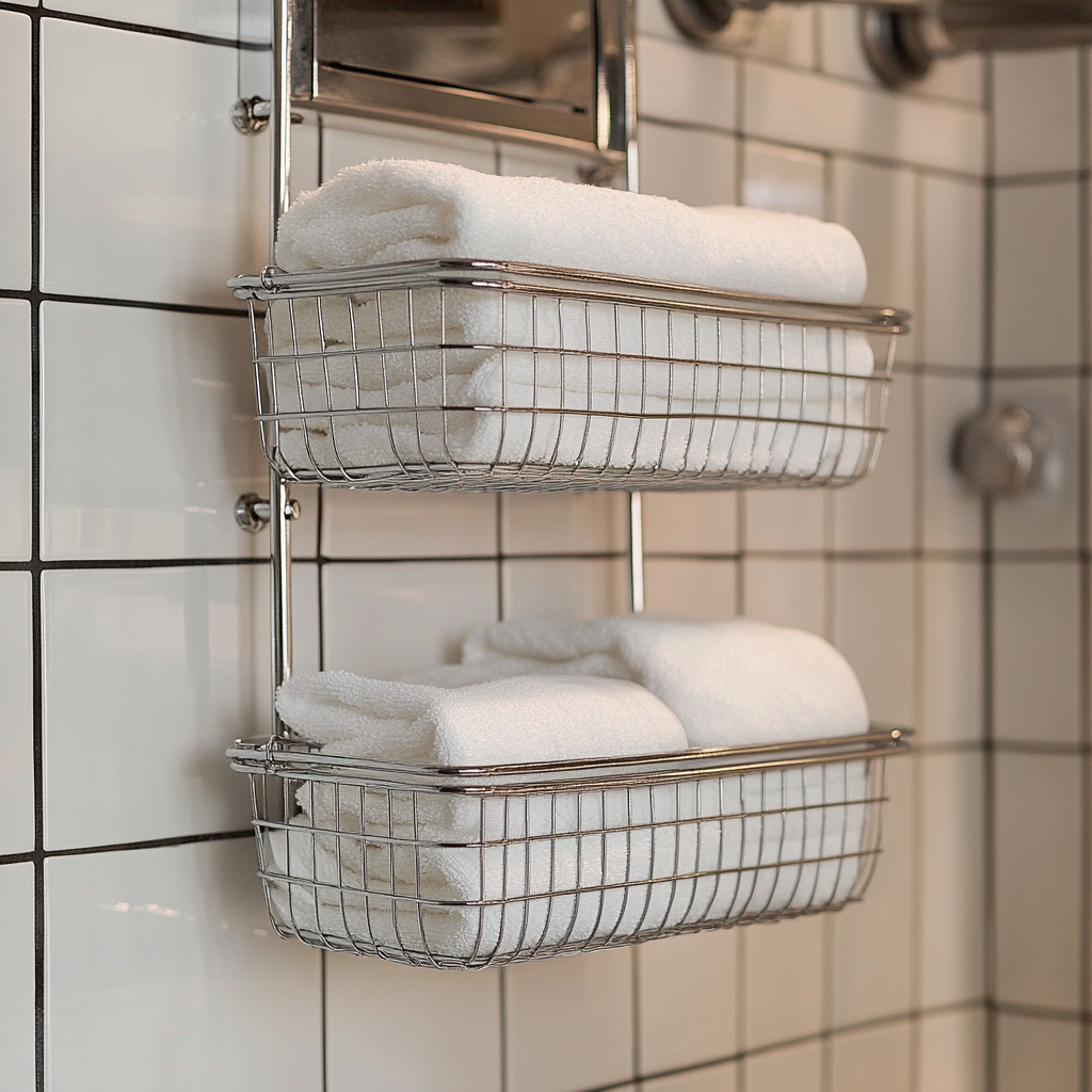 You can hang regular wired metal baskets for a contemporary storage idea for towels and facecloths.