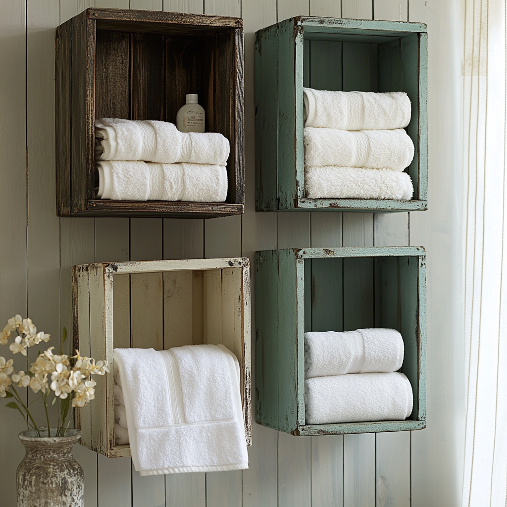You can repurpose old crates with a fresh coat of paint or varnish and hang them on the bathroom walls to store your towels in. You can hang them one below the other for a neater look or in a pattern for a fashionable appearance.