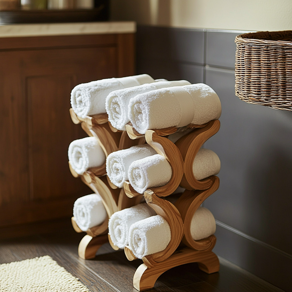 A standing wine rack can be a perfect place to store rolled-up bath towels. It doesn’t just help with storage, but can also give the bathroom visual appeal. You can use towels coordinated with the color of your bathroom for an even better look.