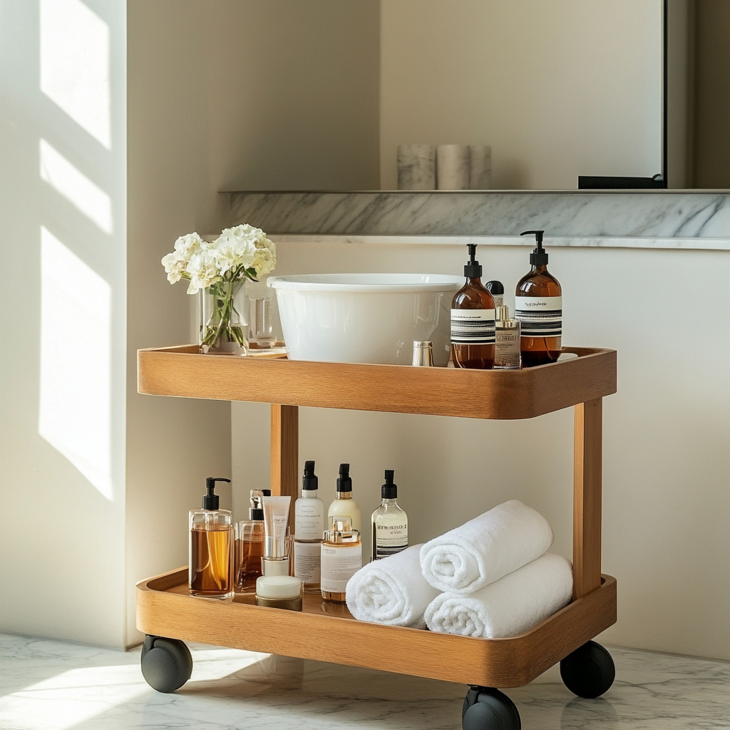 A bar cart can make a great movable storage space for your bath towels and other bathroom accessories.