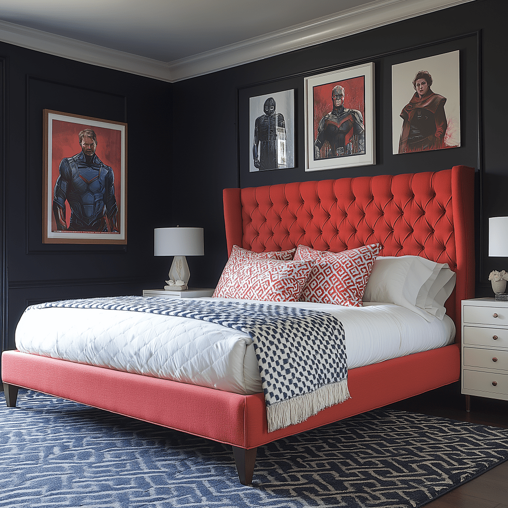 Create a gallery wall of your favorite items right above your bed, ensuring that they are secured well on the wall and don’t fall off the wall onto the bed below (with you in it!)