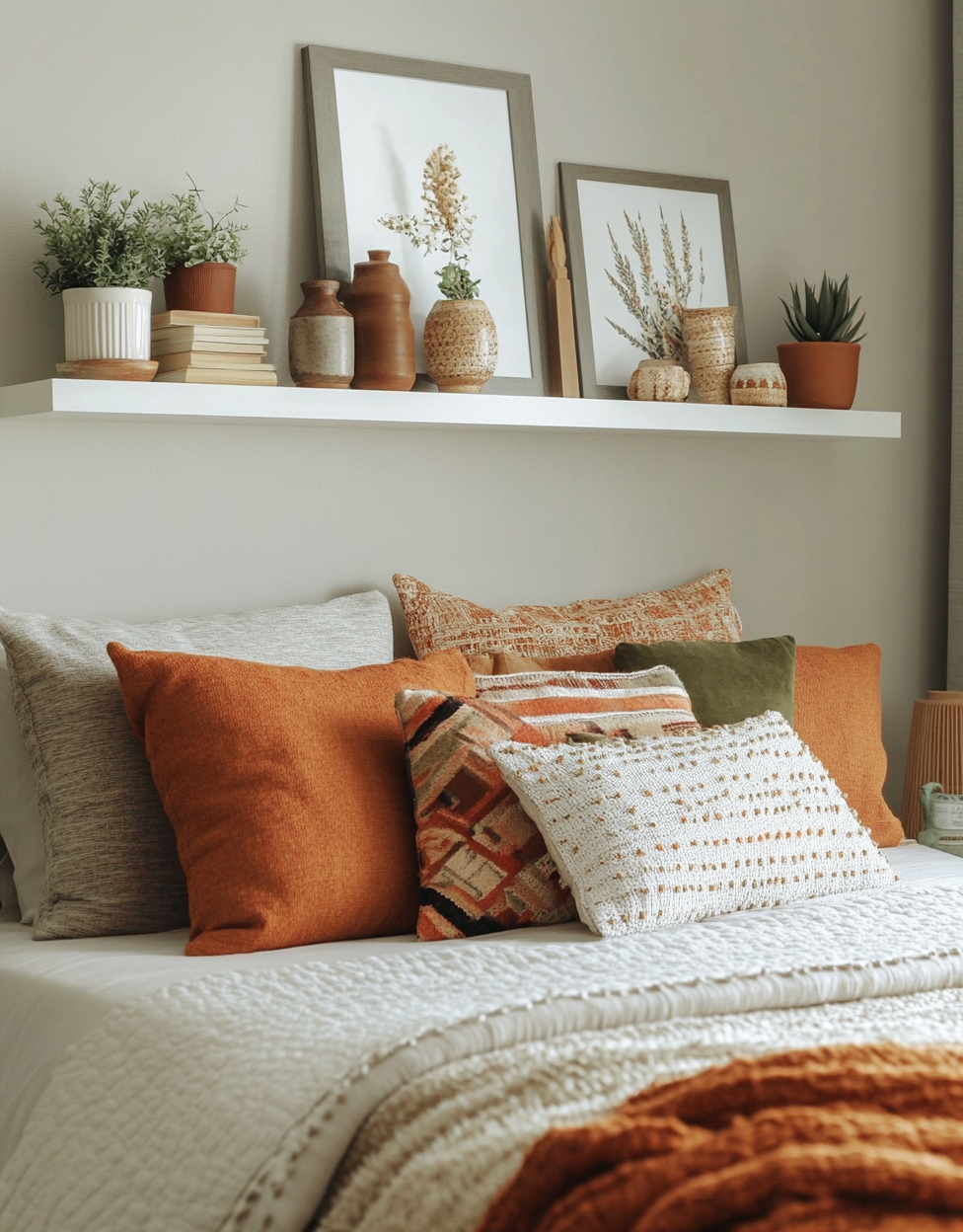 If you’re more of a nature person and artwork, rugs, and knick-knacks on shelves don’t interest you much, then you may want to create a shelf full of plants over the bed. Just install a floating shelf and fill it up with potted plants. It won’t just add life to the space but will also purify the air around you. Just don’t forget to water them!
