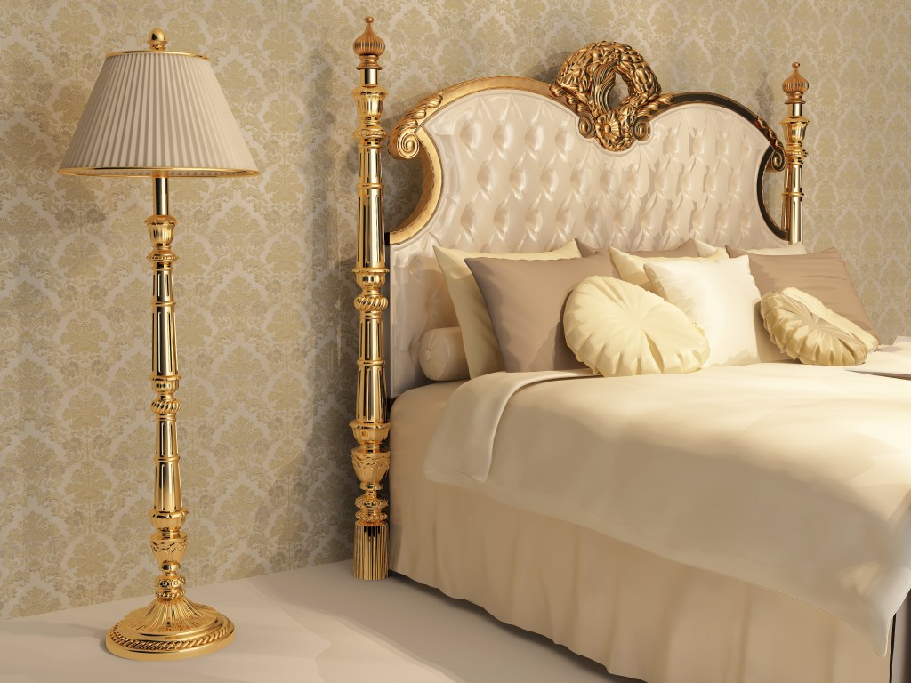 7. The touch of gold in this room, whether it is in the trims of the pillows, the curtains or the vintage style lampshades, complements the pale green and gold wallpaper perfectly, giving the entire room an opulent feel.