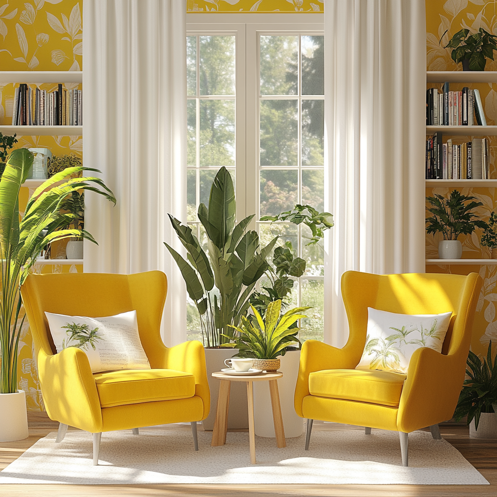 Yellow walls bring warmth and cheer to any room. To balance this brightness, opt for white curtains for a fresh, airy feel or go for green curtains to create a harmonious, complementary color scheme. Blue or purple curtains offer an eye-catching contrast, while black curtains can ground the space with a bold, modern edge.