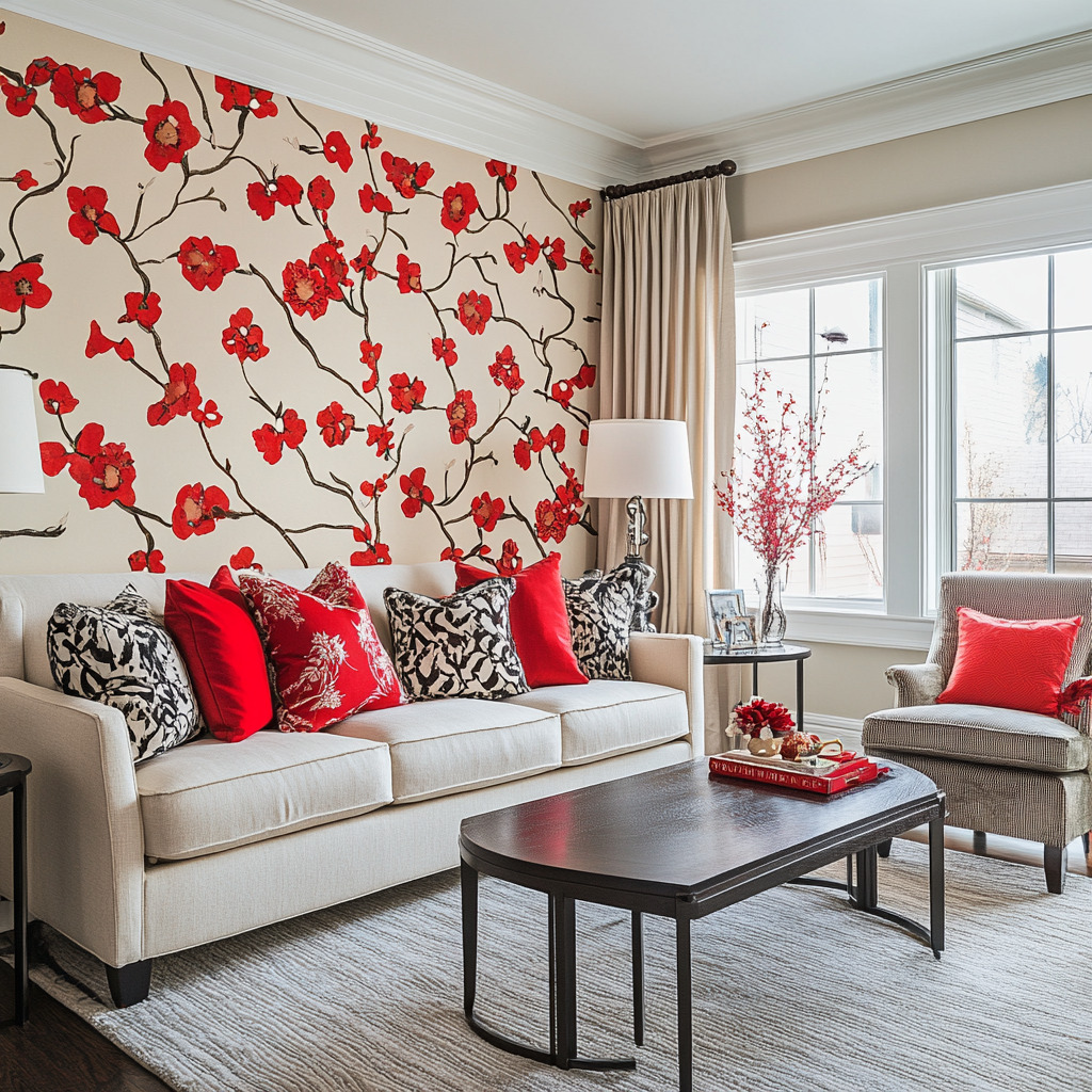 The red accents added to the living room here work perfectly well with the red flowers in the wallpaper.