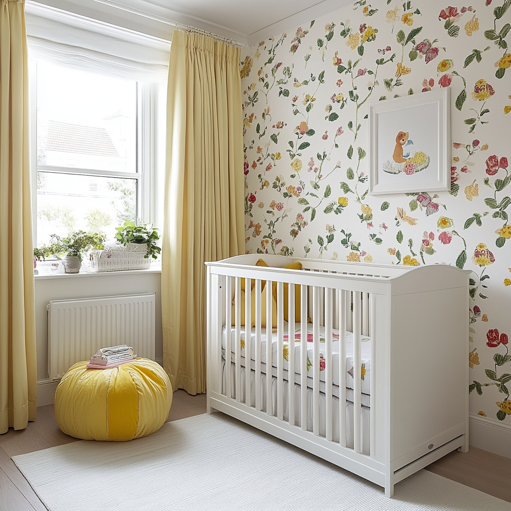 The pristine nursery here done up in white looks bright and cheerful with the floral wallpaper breaking the monotony of all the white used.