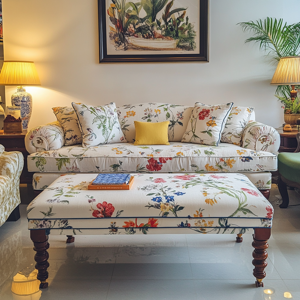 The center table upholstered in a floral print, and a couple of more floral elements added to the décor here, lend just the right amount of character to this living space.