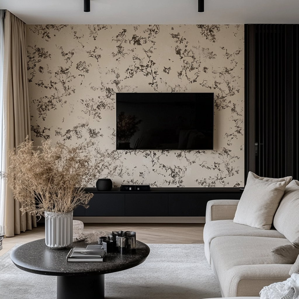 The beige wallpaper here with floral motifs works very well with the black and white accents that the other elements bring with them in this setting.