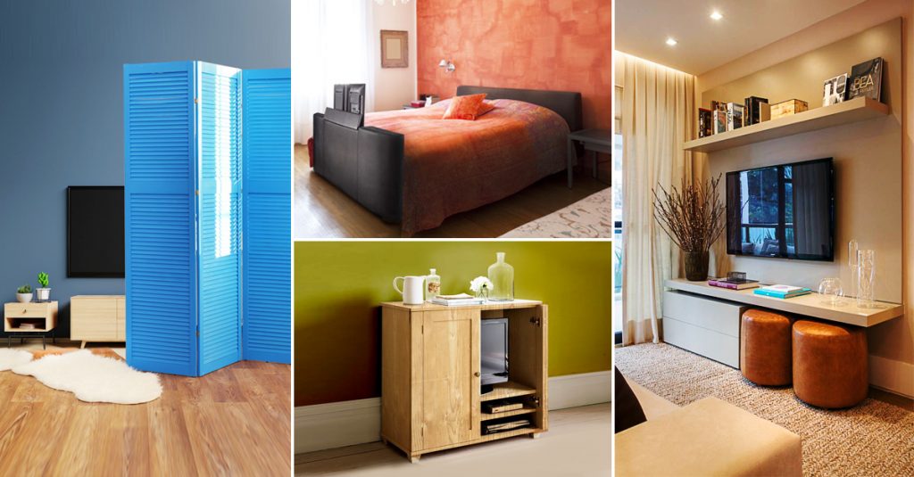 One of the most simple and reasonable ways to conceal a TV is to install a movable screen before it. The best part of this solution is that no matter how big the TV is, you will have no difficulty finding a screen sufficiently substantial to disguise it.
