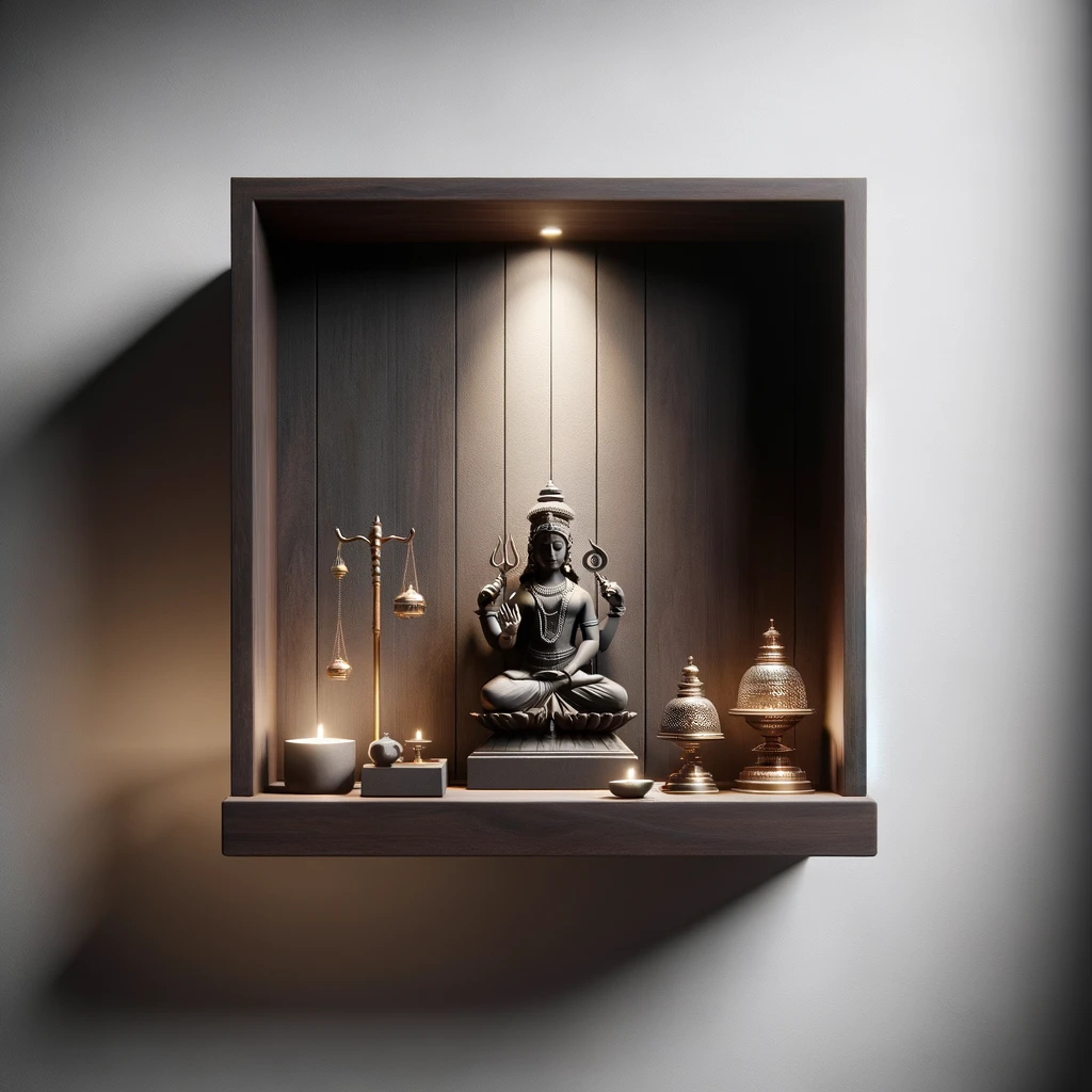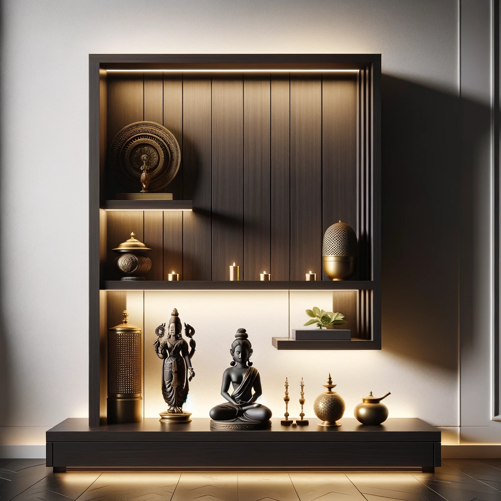 In smaller homes, a simple and minimalistic approach to the prayer shelf can be incredibly effective. A basic unit in a dark wood finish, complemented by subtle backlighting, can create a contemporary and serene prayer space. This design is unobtrusive yet elegant, ensuring that your prayer area fits seamlessly into the modern aesthetic of your home.