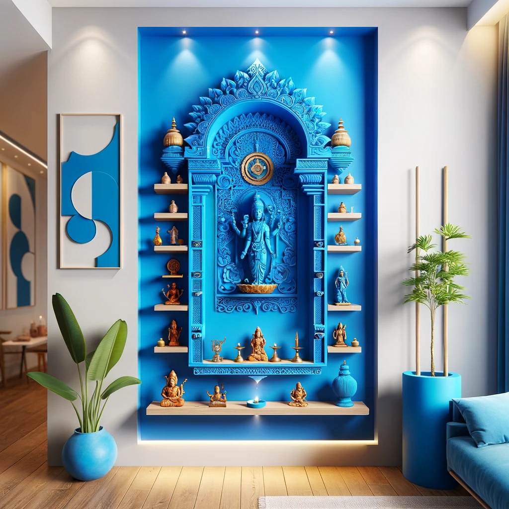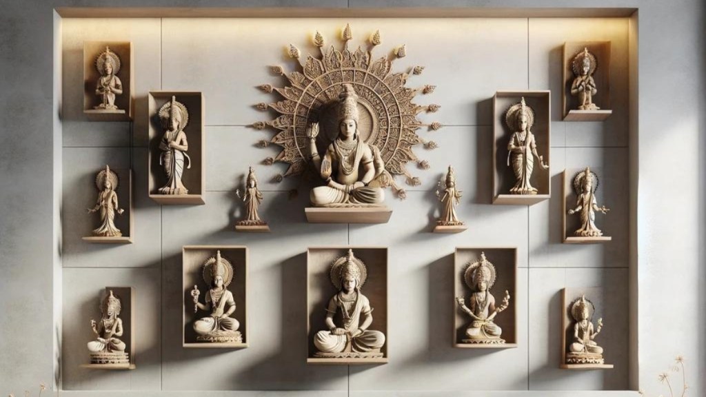 The beauty of floating shelves lies in their versatility and the creative freedom they offer. Arranging these shelves in unique patterns not only caters to the aesthetic appeal of your home but also allows for a personalized sacred space. This idea is perfect for showcasing a diverse collection of deities, ensuring each idol gets its rightful place. The arrangement can be tailored to the orientation of your room, ensuring that the sacred corner is harmonious with the overall design of your living space.