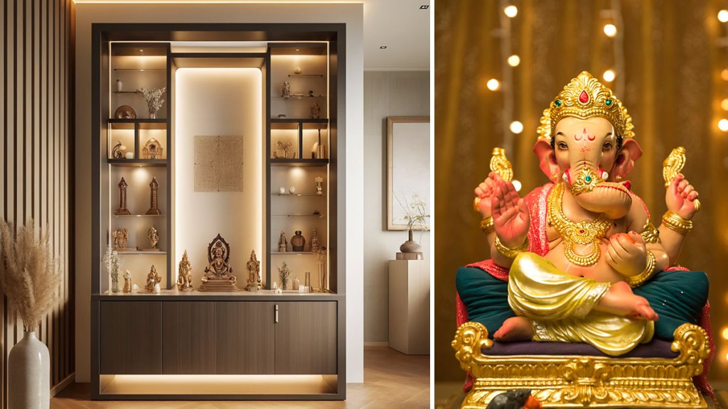 The beauty of floating shelves lies in their versatility and the creative freedom they offer. Arranging these shelves in unique patterns not only caters to the aesthetic appeal of your home but also allows for a personalized sacred space. This idea is perfect for showcasing a diverse collection of deities, ensuring each idol gets its rightful place. The arrangement can be tailored to the orientation of your room, ensuring that the sacred corner is harmonious with the overall design of your living space.