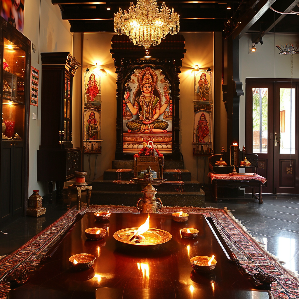 Lighting sets the tone of your Puja space. For larger rooms, ceiling lights can enhance the ambiance, while a chandelier can add elegance to smaller spaces. If your Puja space is a unit within a room, consider adding focused or decorative lighting to accentuate the sacred area.